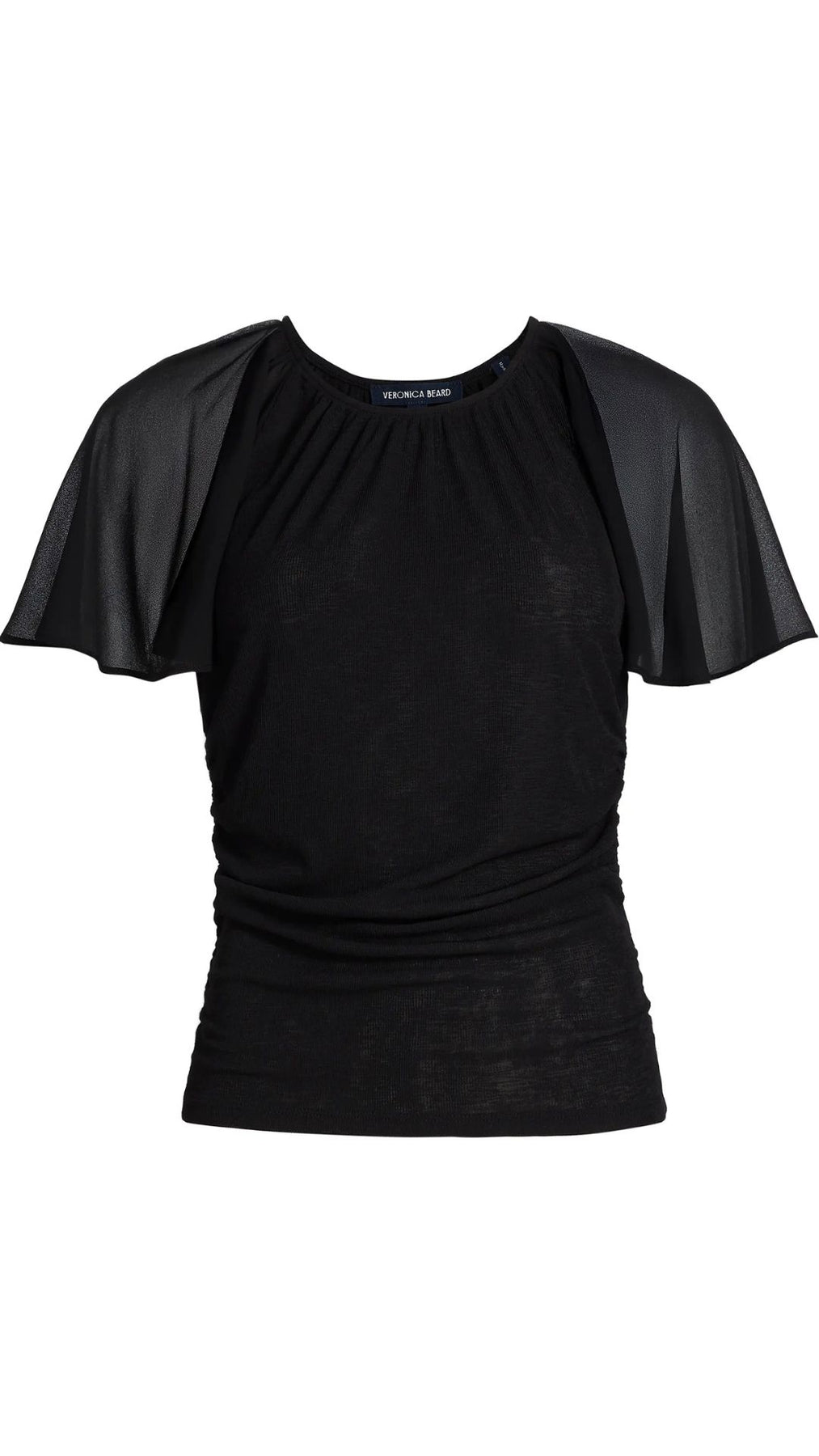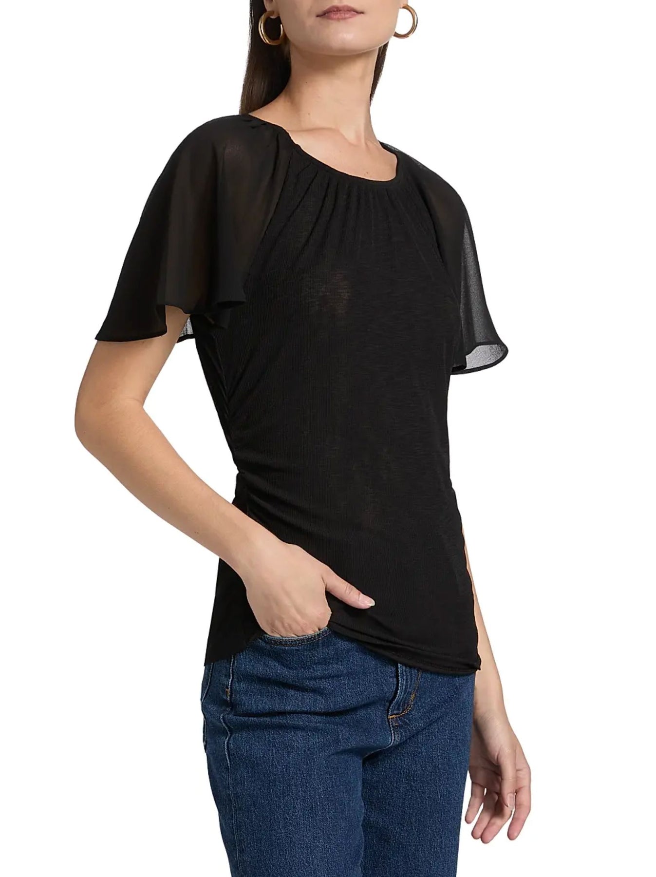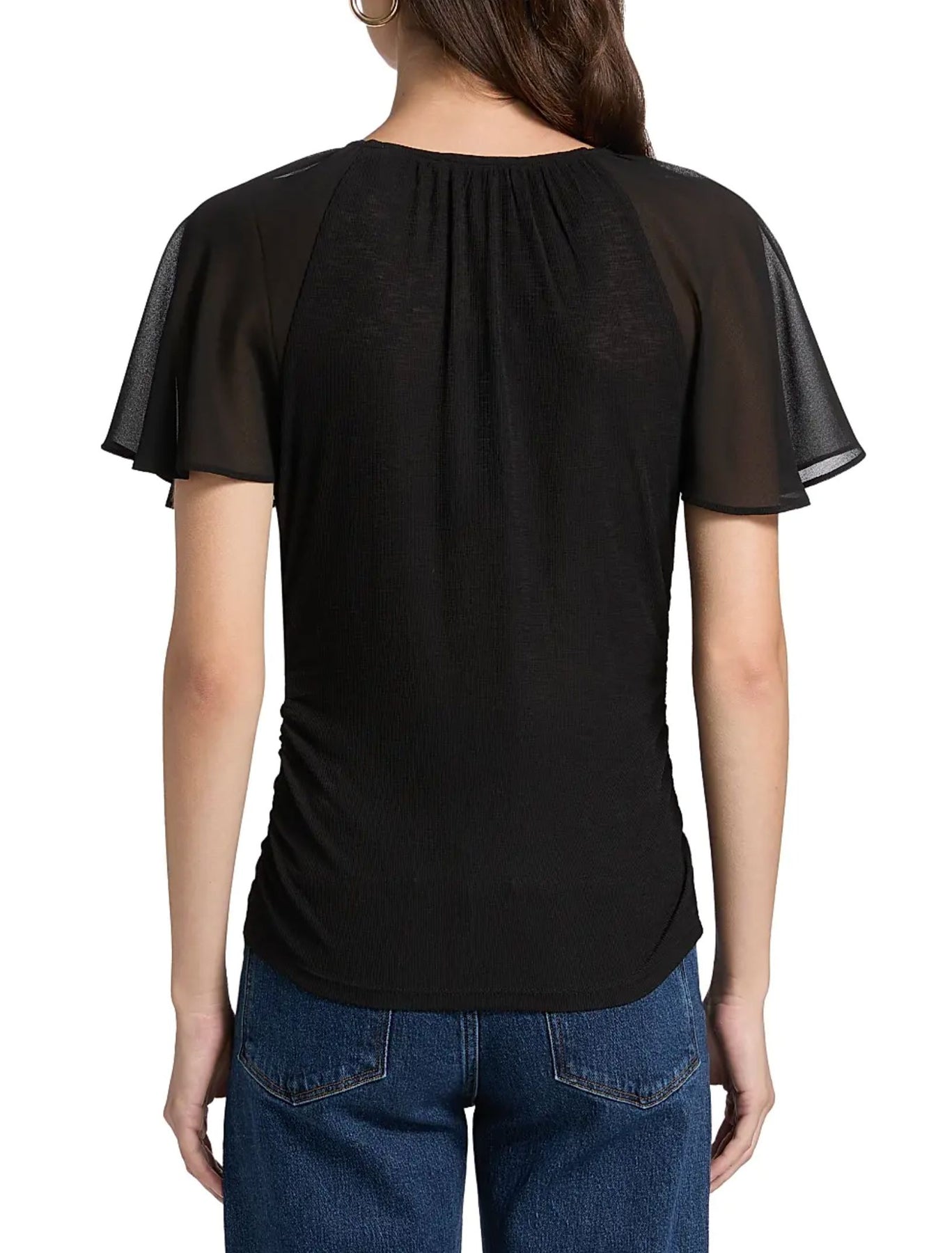 Fluttery chiffon sleeves sweeten the style story of this shapely ruched top that's further softened with gathers radiating from the neckline.