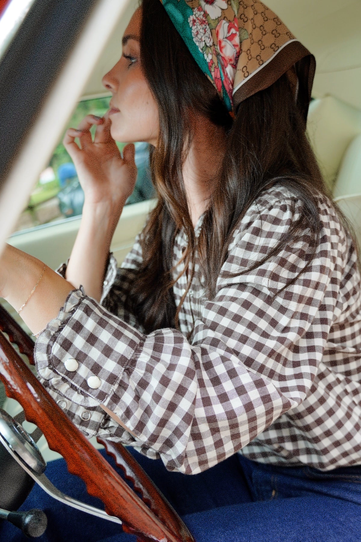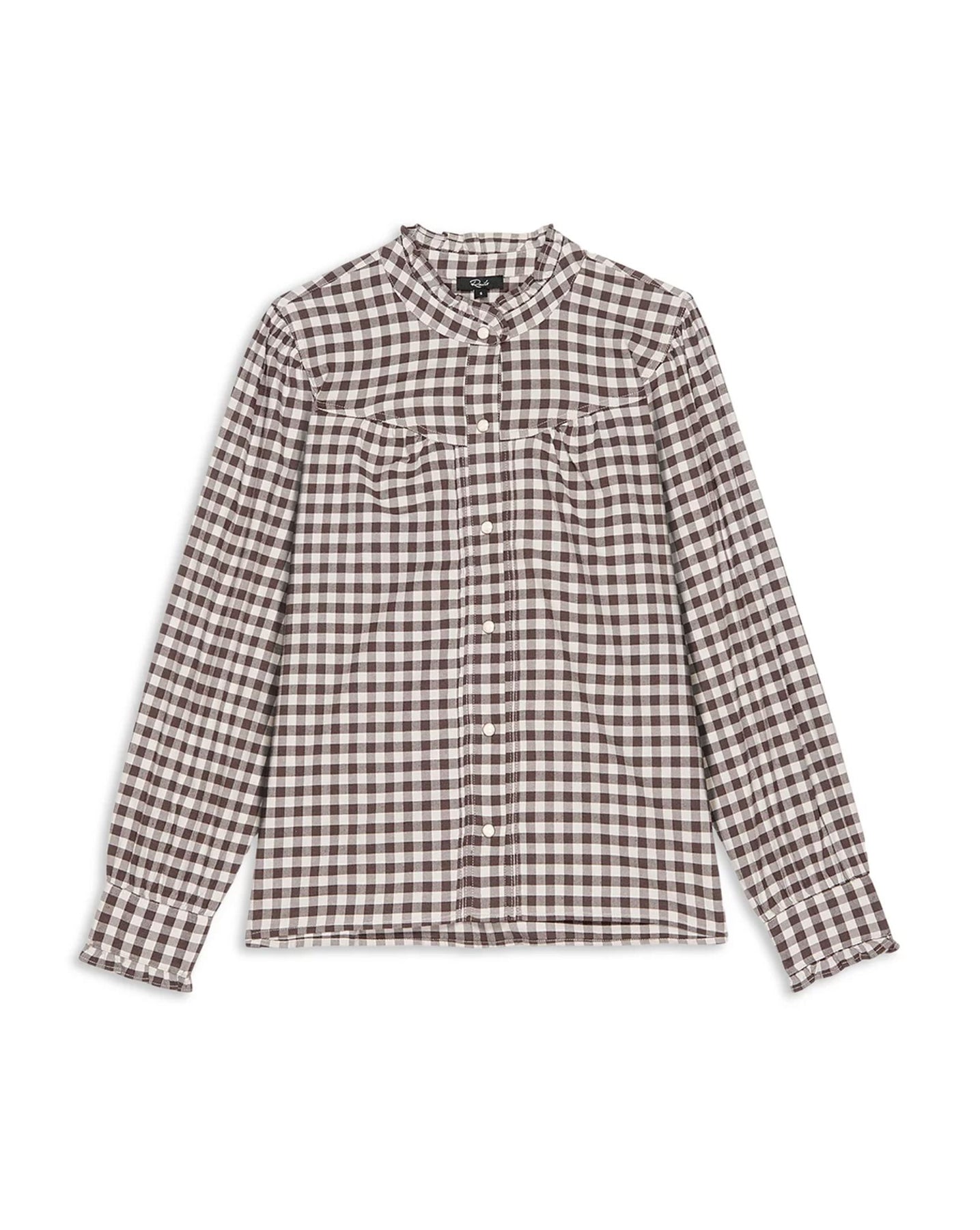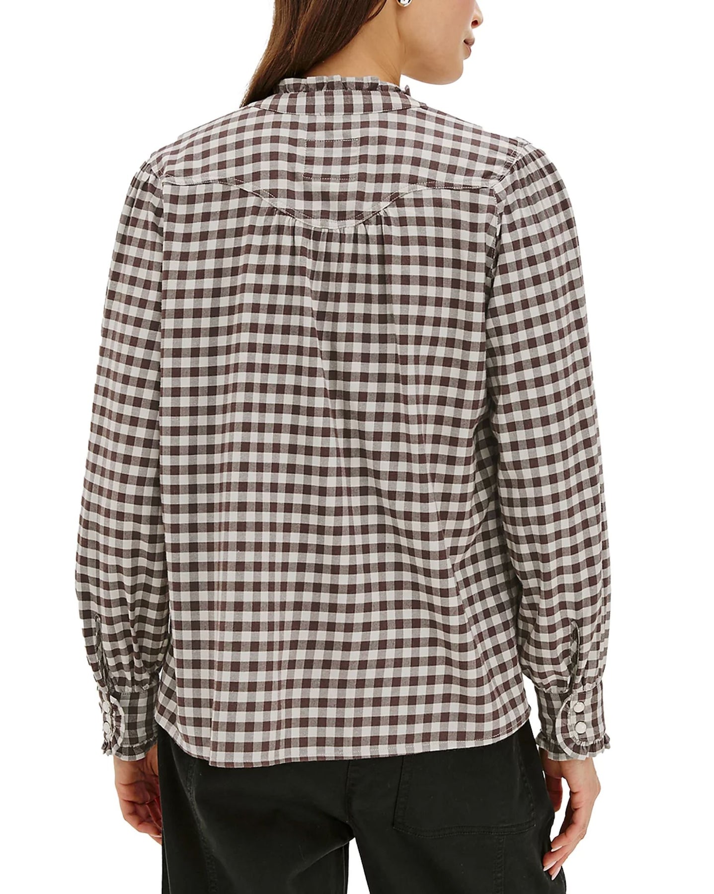 The Alanna is a light brushed cotton-blend plaid blouse that balances comfort with refined details. A curved yoke, ruffled collar, and marble snap buttons nod to Western inspiration.