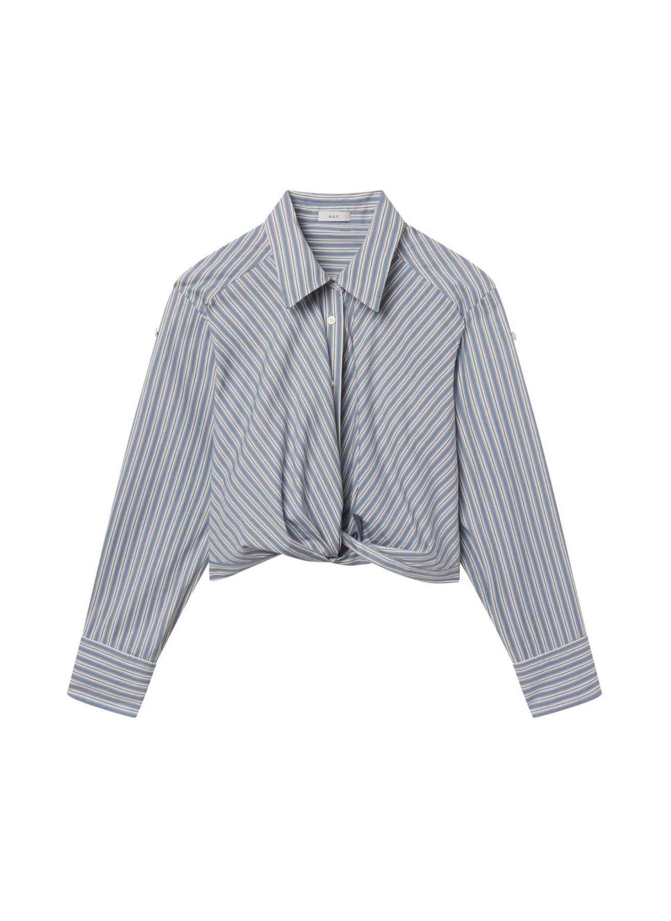 The Leo Top is crafted from crisp 100% cotton in a vertical shirting stripe of white and steel blue. This cropped button-down silhouette features a sharp collar, convertible long sleeves, and a twisted hem detail that hits at the navel for a relaxed, modern shape.