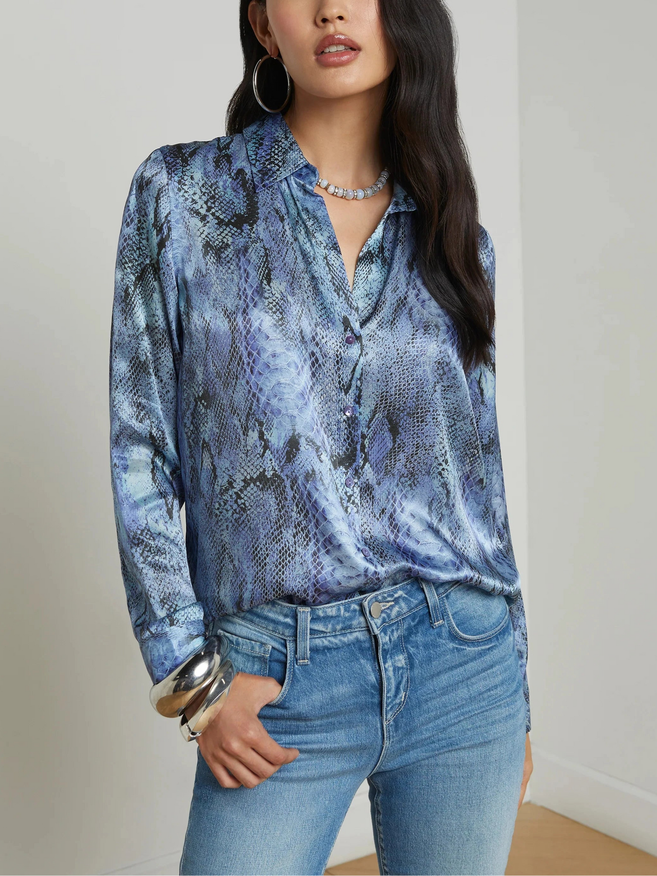Meet the iconic long-sleeve silk button-down that belongs in every wardrobe. Reimagined each season in fresh colorways and prints, the Tyler is back in an ice blue snake print.