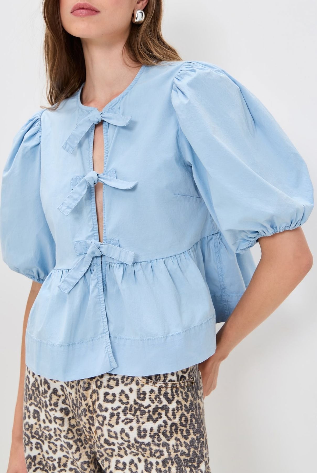 GANNI's Washed Stretch Cotton Peplum Blouse is crafted from lightweight stretch poplin, featuring a gathered waist with ruffle peplum hem, short puff sleeves, and front ties. This versatile top effortlessly transitions from casual daytime wear to evening events, offering a silhouette that's perfect for both office attire and weekend outings. GANNI, known for its contemporary Scandinavian designs, infuses this blouse with fashion-forward elements, embodying the brand's commitment to creating premium casual wear with a touch of mid-range luxury.