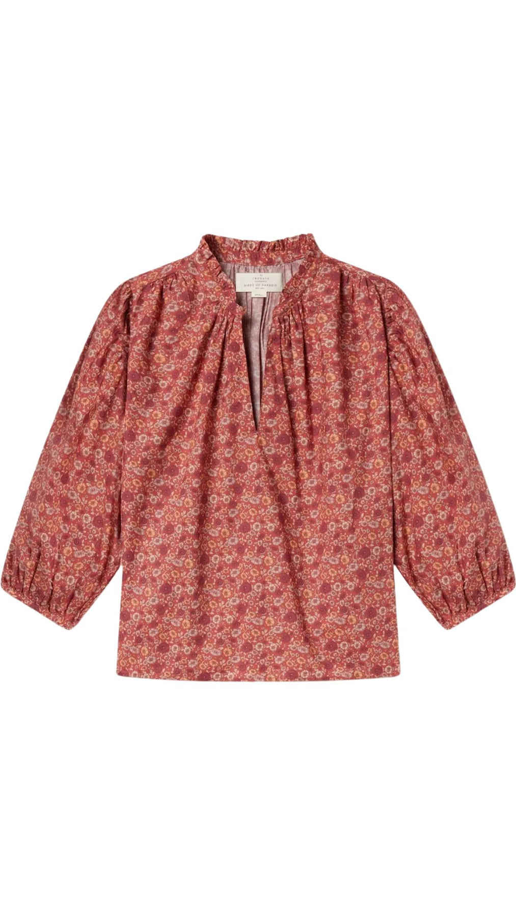 The Orly Blouse is a slightly cropped, billowy blouse with straight bottom hem, split v-neckline and buttoned crown collar. Gathered three-quarter length sleeves finished with delicate bindings. Includes our signature back detail with a gathered waist tab.