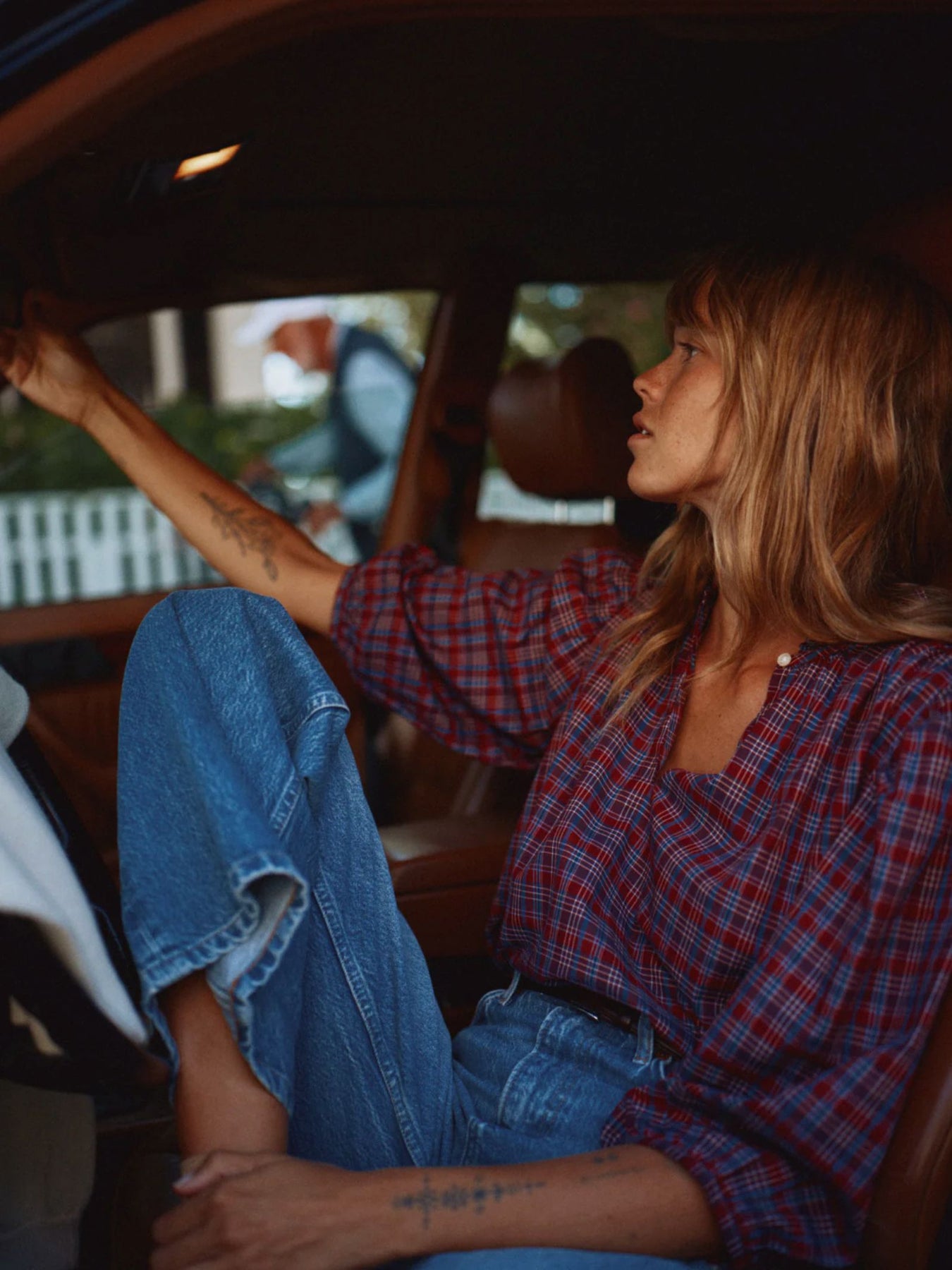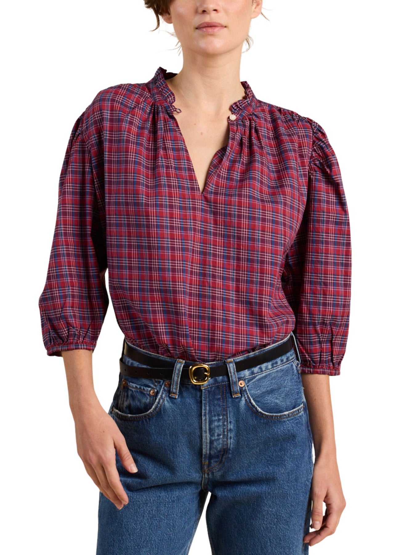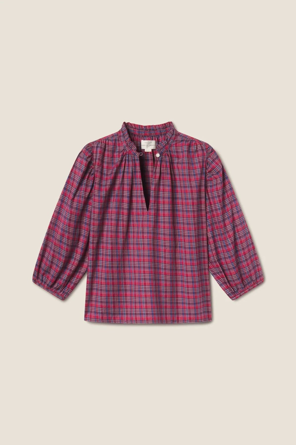 The Orly Blouse is a slightly cropped, billowy blouse with straight bottom hem, split v-neckline and buttoned crown collar. Gathered three-quarter length sleeves finished with delicate bindings. Includes our signature back detail with a gathered waist tab. Shown here in Mulled Wine Plaid and made from our cotton.