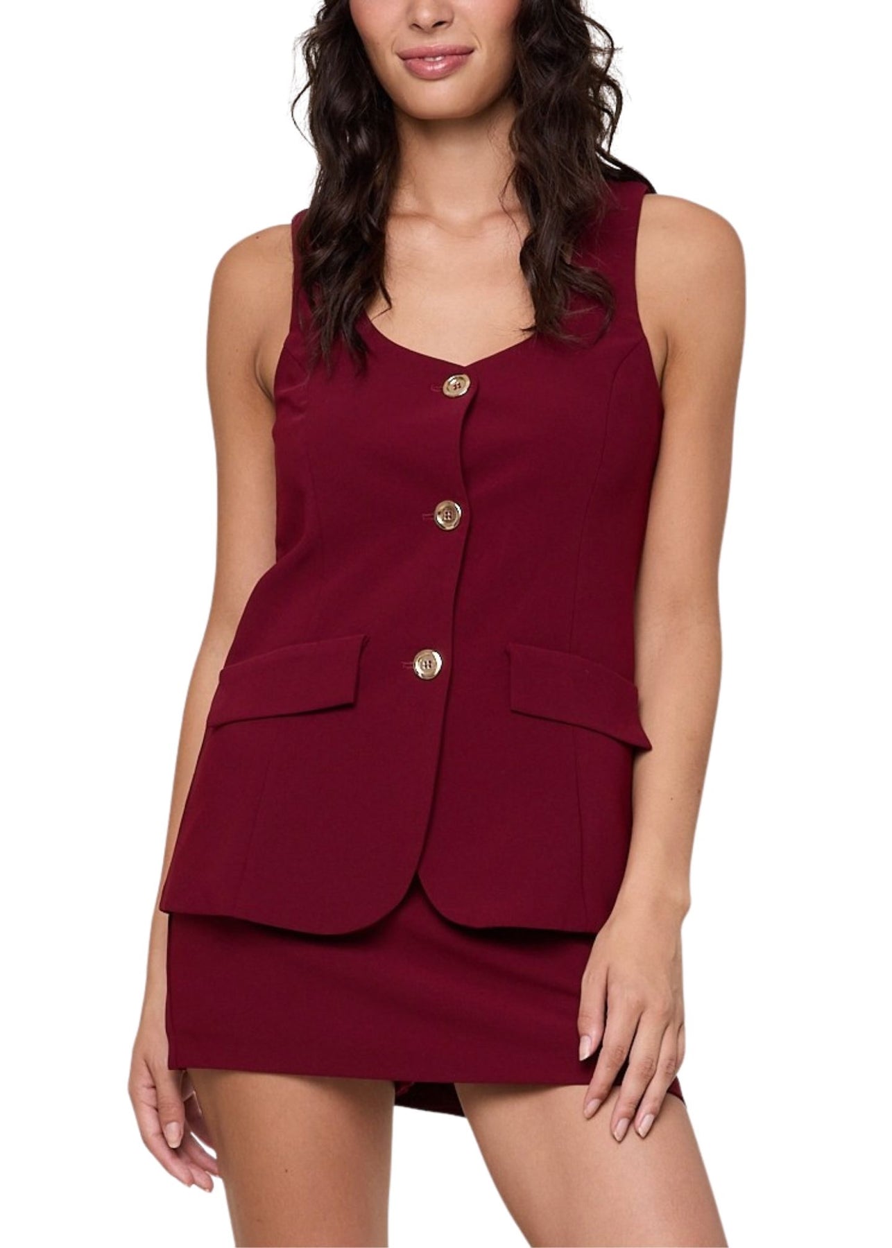 Make a statement with this deep red tailored vest, featuring sleek gold buttons that add a touch of charm. Playfully pair it with the matching skort to create a coordinated set that’s perfect for mixing and matching your favorite looks. This vest brings a fun, polished edge to any outfit!