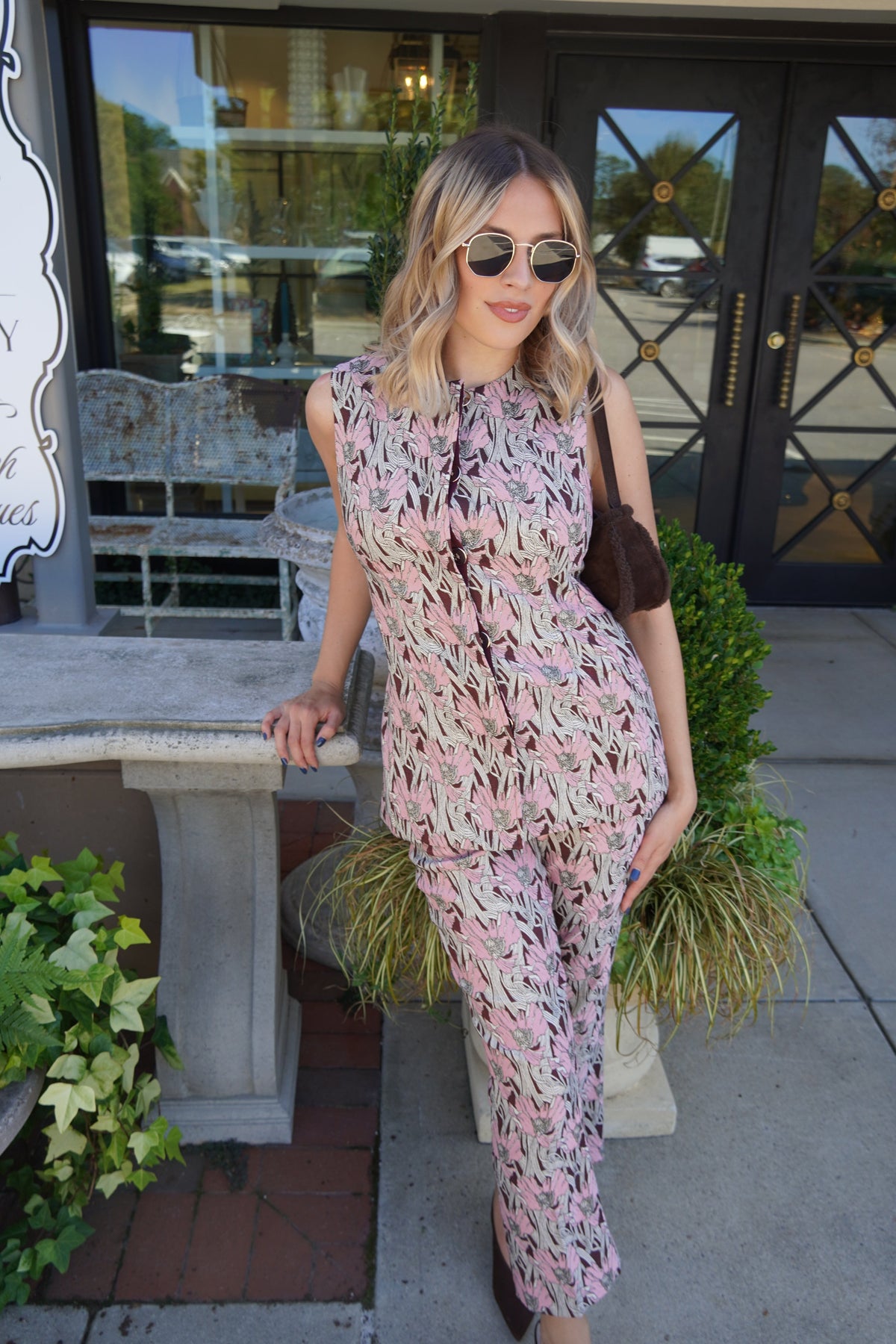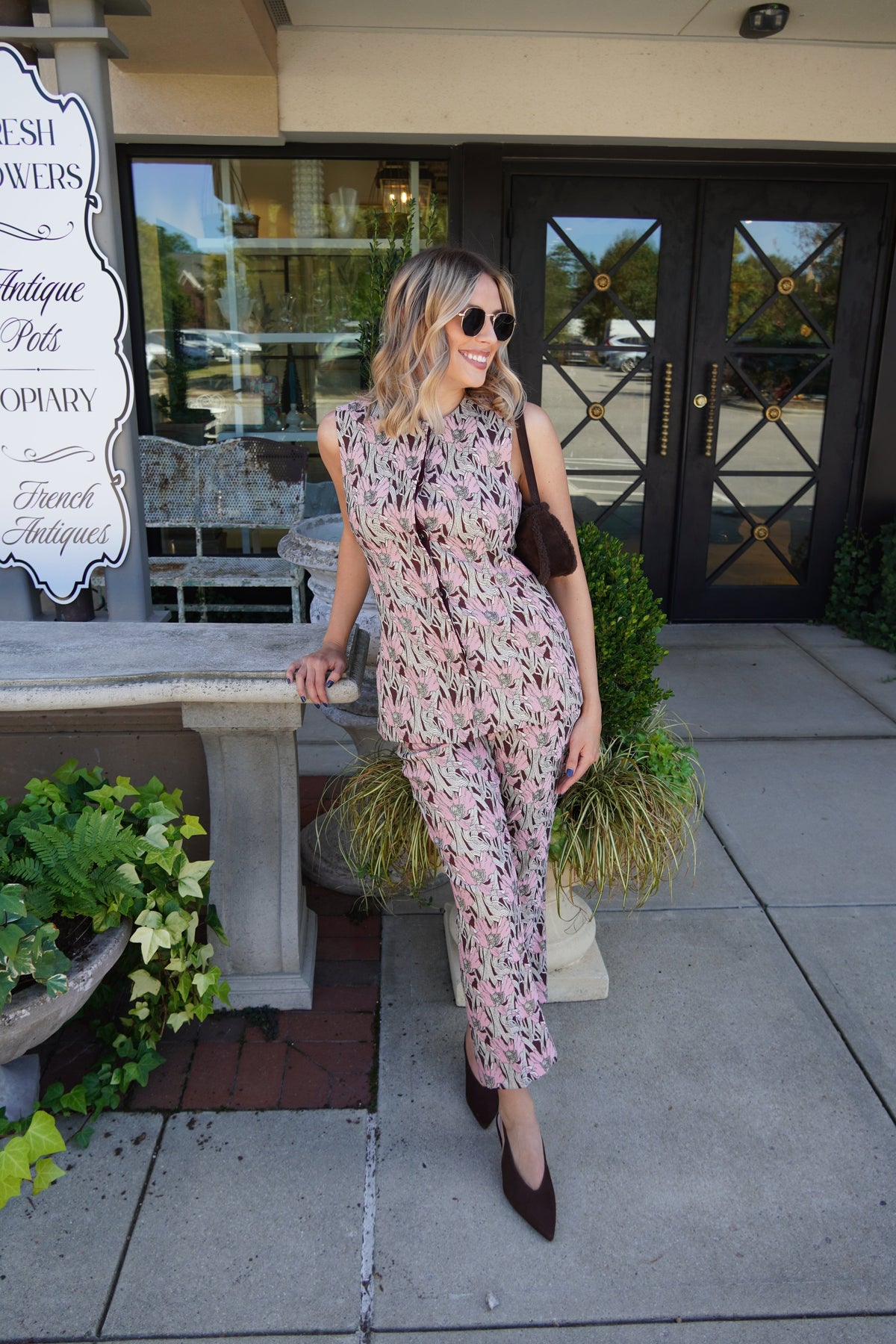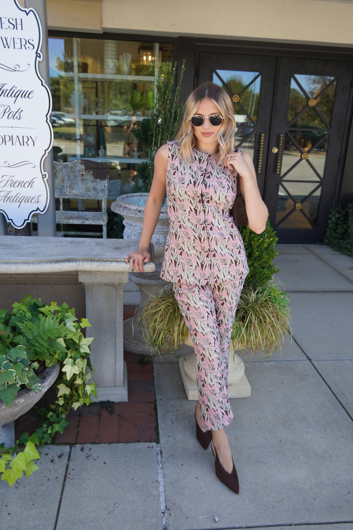 A VB favorite, reimagined in burgundy and pink florals. The Arte pants are cropped and high-waisted with a slim fit and slight flare. Flat welt pockets and a hidden hook-and-bar closure create a sleek, tailored look, while metallic gold threads add a subtle sheen for an elevated finish. Perfect for everyday polish, style it with the coordinating Jessup vest for a matching set or with a cashmere tank top for something more relaxed.