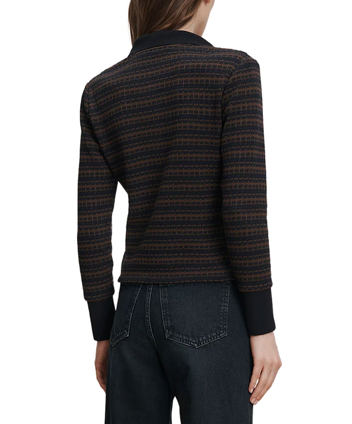 The polo, perfected. The Kamal is crafted from a rich navy-and-brown striped knit in a long-sleeved polo silhouette. Solid navy cuffs and a Johnny collar add dimension to this easy wardrobe staple. Pair with the coordinating Yadira pant for off-duty chic, or style with tailored trousers for polished ease.