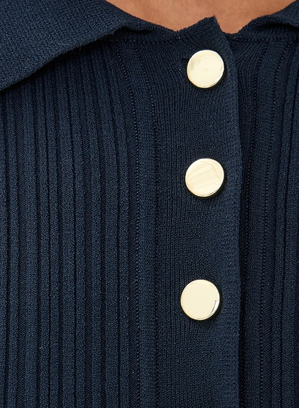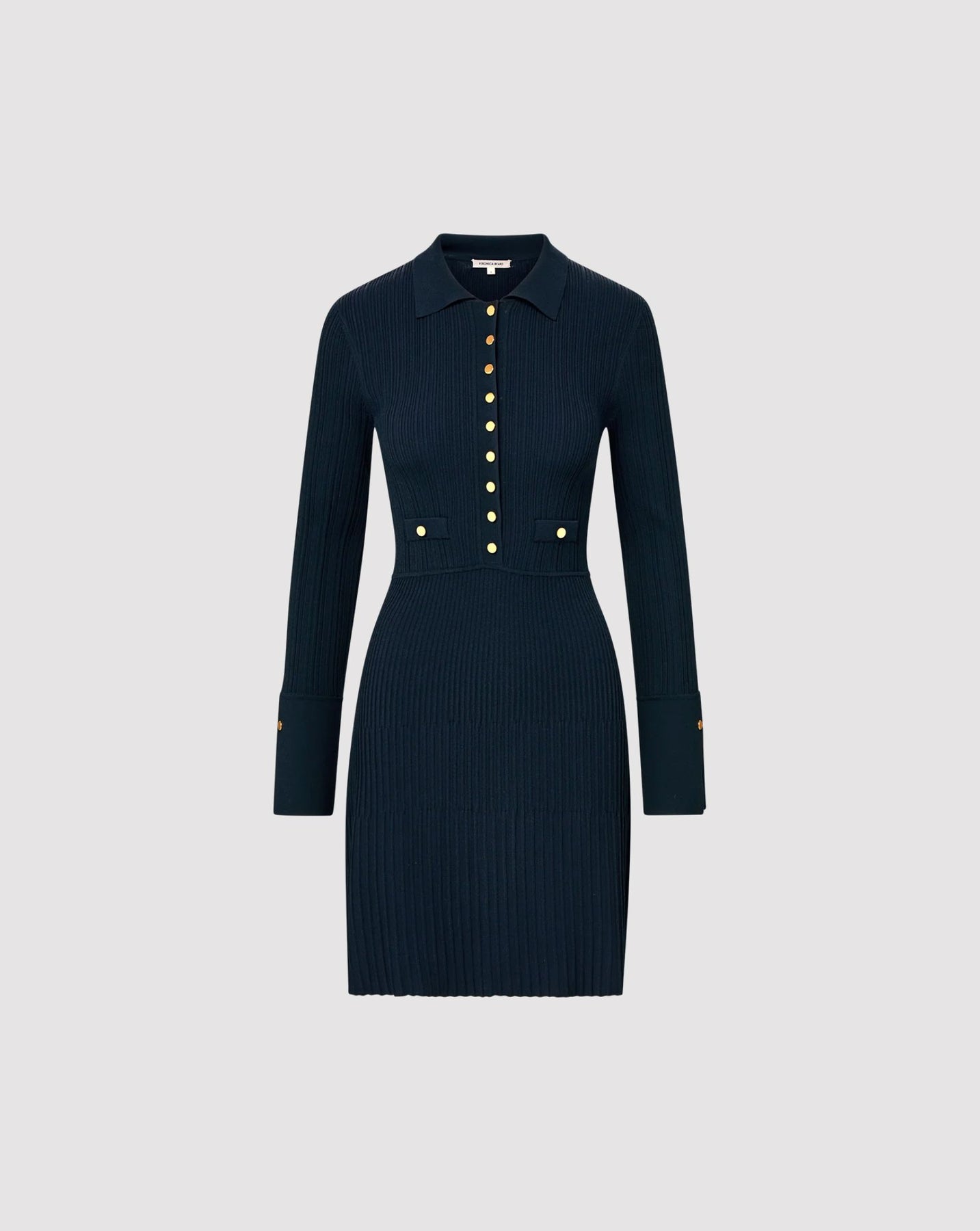 The ultimate 9-to-9 dress, the Lauper is refined enough for the office and cool enough for cocktails. Spun from a navy ribbed stretch-knit, it features a fitted mini silhouette and a trim collar that flows into a half-placket of gold buttons. Faux front pockets and elongated cuffs complete the look. A one-and-done style for instant polish, pair it with heels, flats, sneakers...you name it.