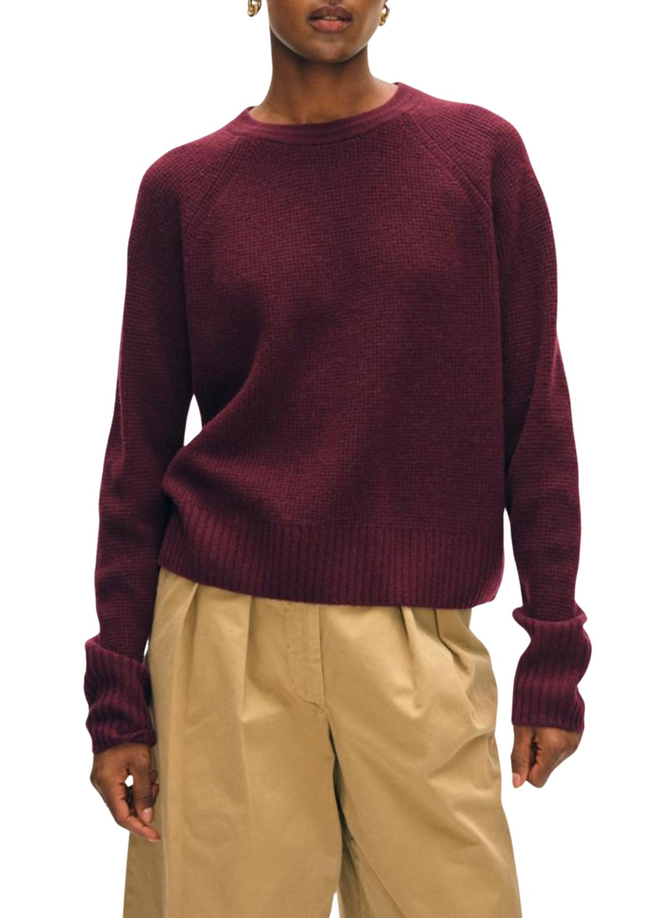 Look to the Cashmere Waffle Sweatshirt when your aim is comfort, but you still want to look elevated. With raglan sleeves and a relaxed fit, it's knitted from cashmere in a signature waffle-knit stitch for touchable texture. Style it with jeans by day and polished separates by night. 100% Cashmere Hand wash cold or dry clean. Do not twist or wring. Reshape and lay flat to dry. Warm iron if needed. Length (Size S): 23" Model is 5'10.5" and is wearing a size Small.