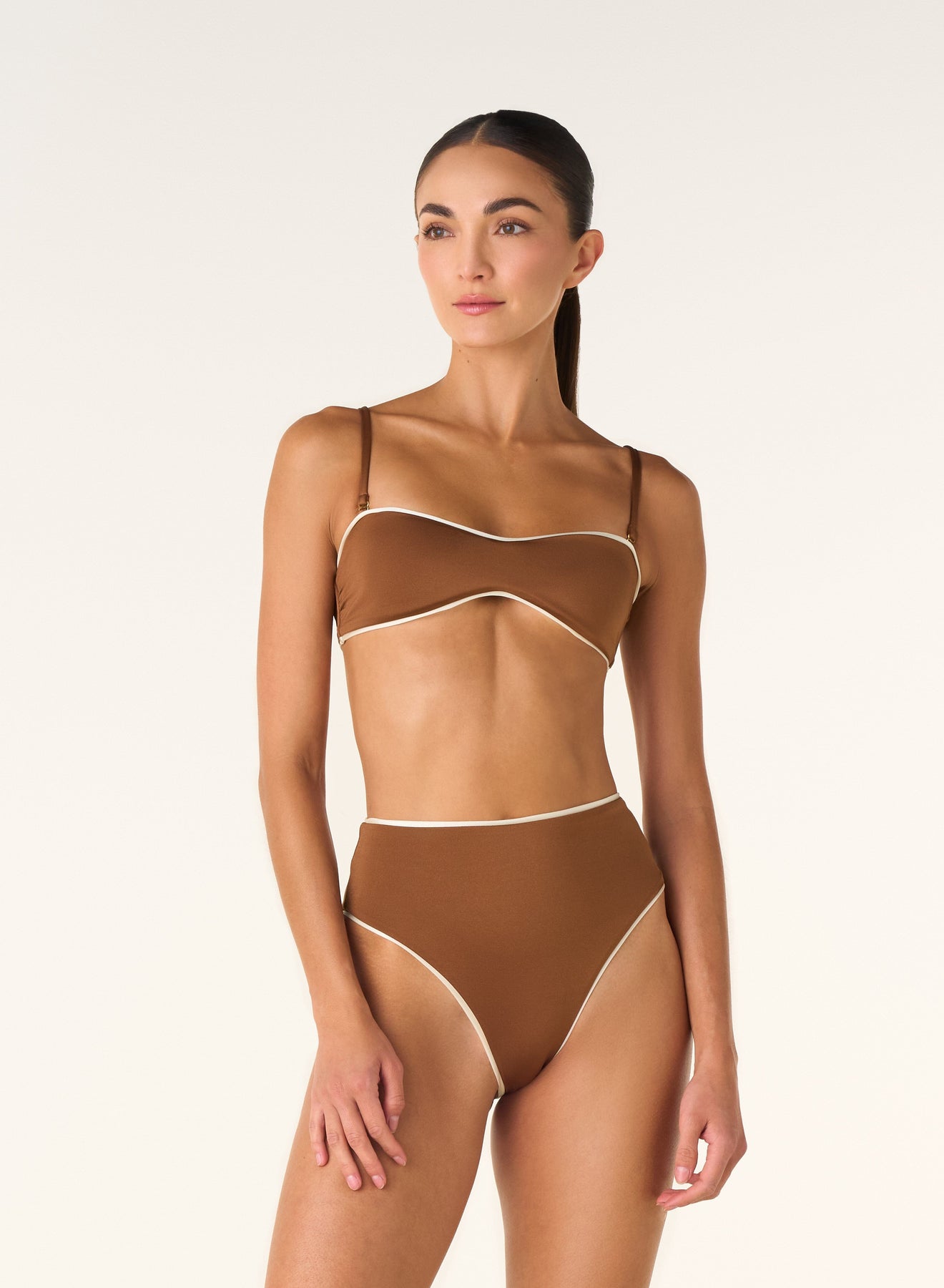 The Banu Espresso Bikini Top stands out with its structured silhouette and warm tone. Made from stretch fabric with ivory contrast trim, it combines clean lines with a feminine back tie. A versatile piece that embodies Palmacea’s relaxed sophistication.