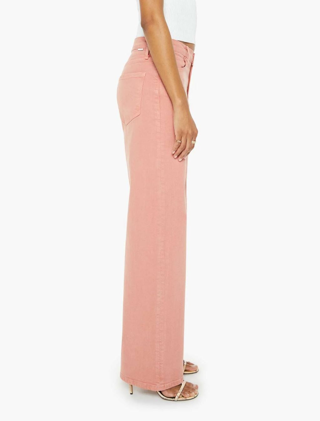 Pants designed to sit on the hips with a slouchy fit, a loose straight leg and a 32-inch inseam with a clean hem. Made from stretch cotton, the pants are a light coral with tonal hardware.