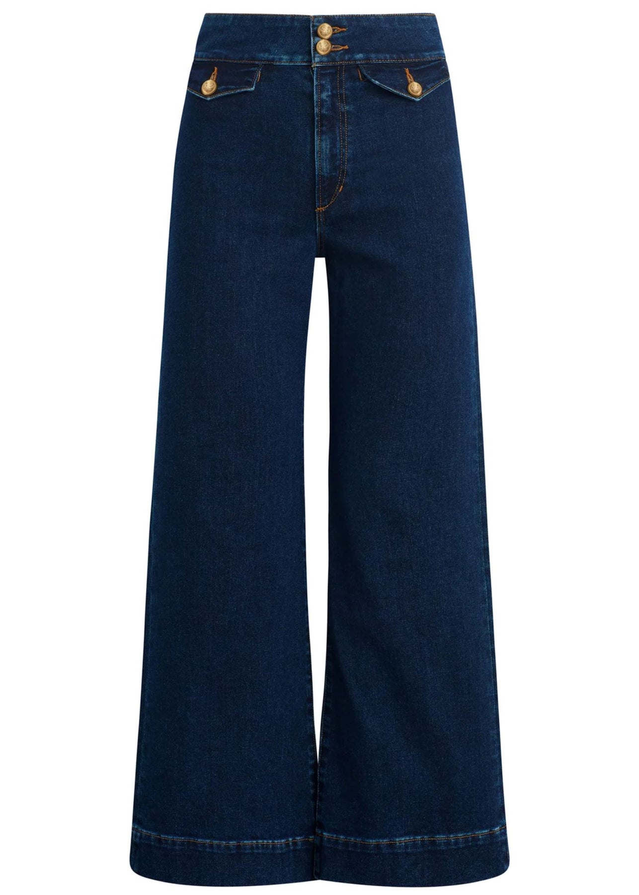 A high rise and wide leg fit with front flap pockets finished with novelty gold buttons that falls to the ankle.