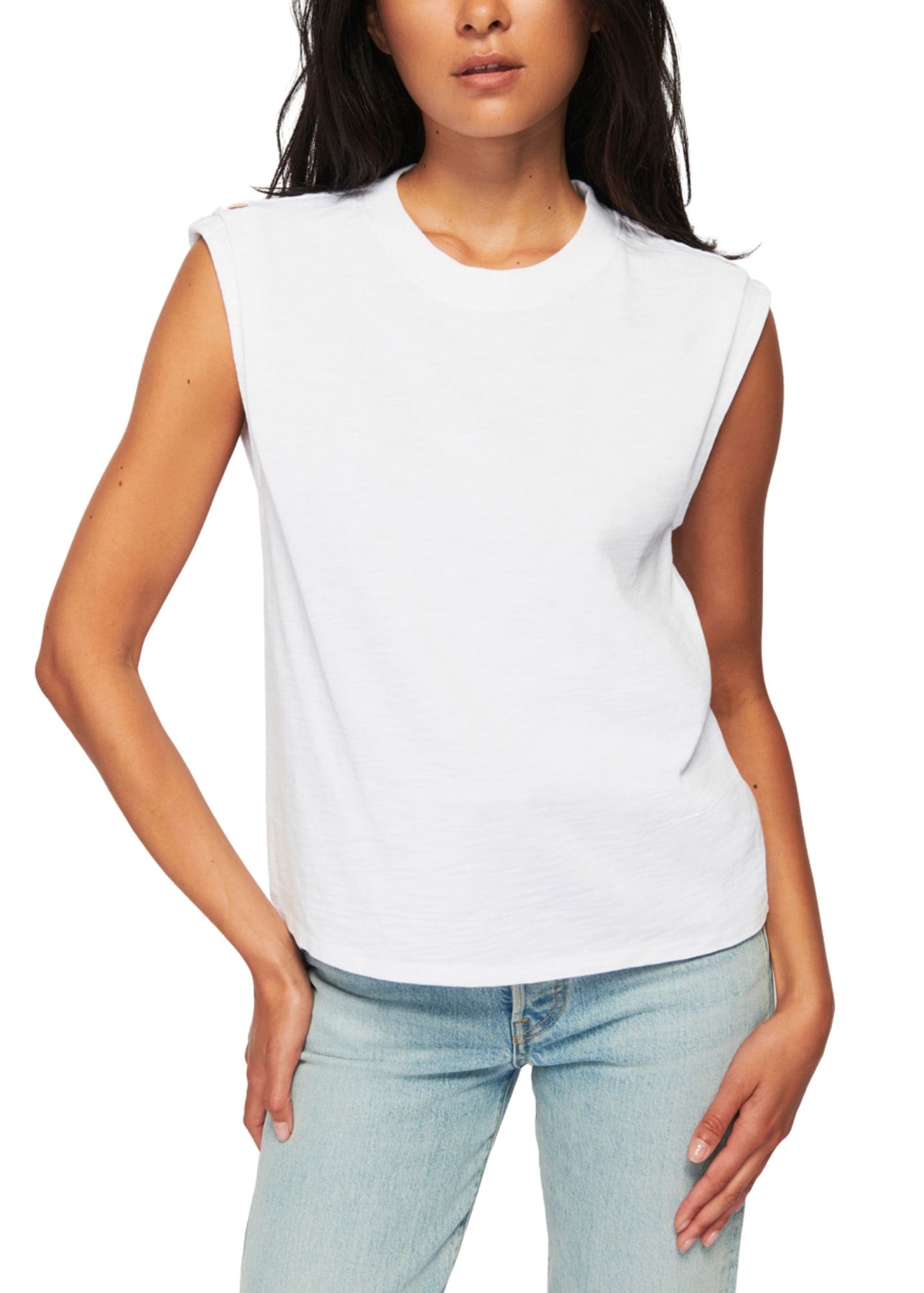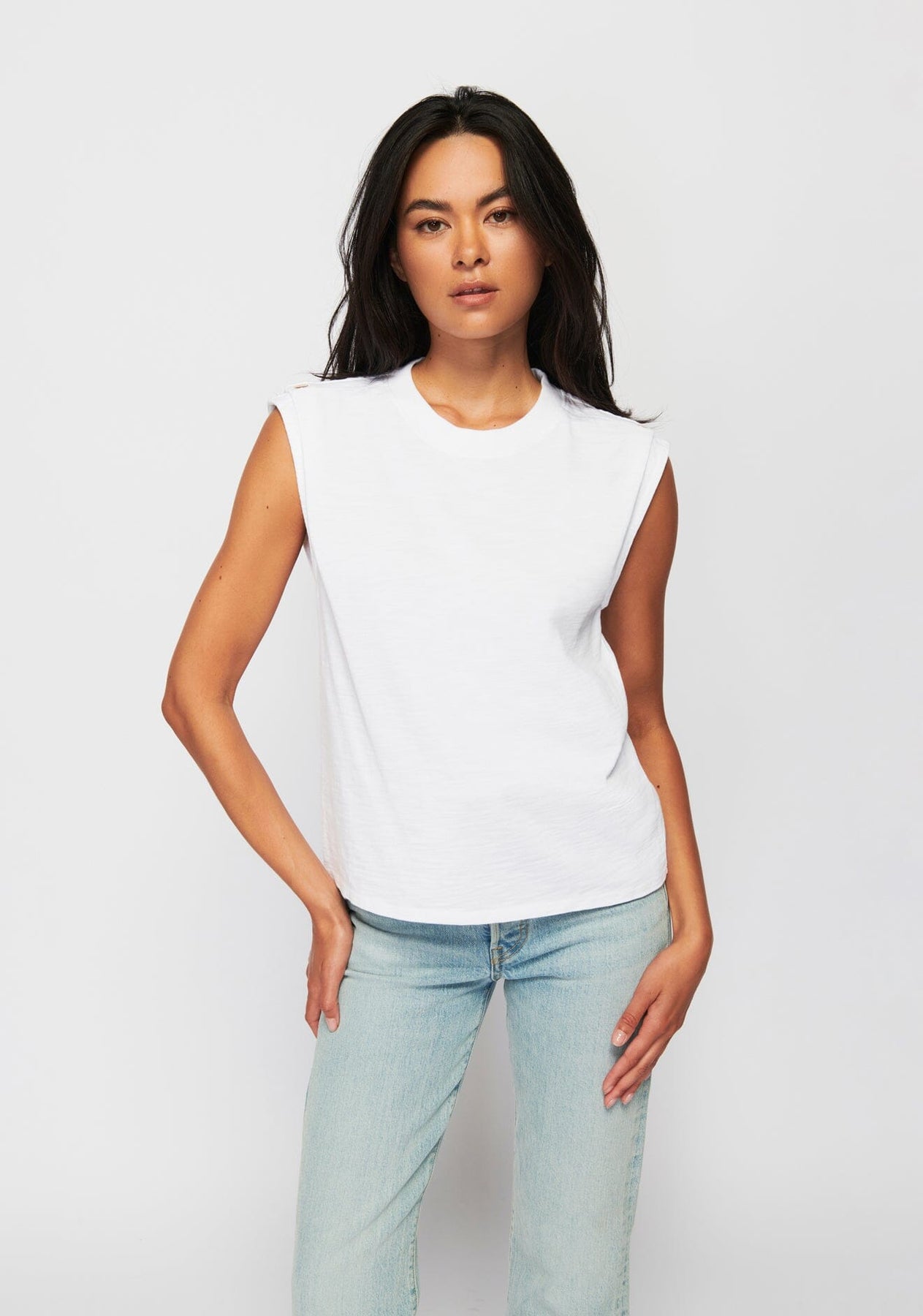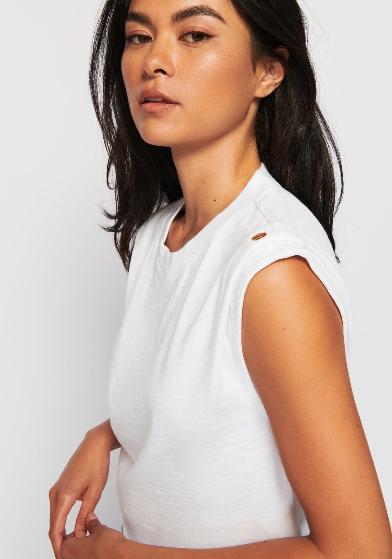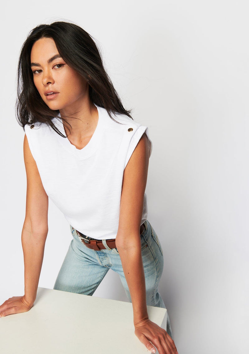 A feminine touch on your go-to muscle tee. (It's the gold snaps and subtle shoulder pleats). 100% Peruvian Cotton