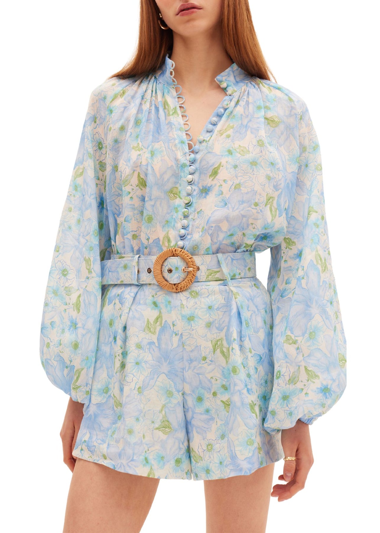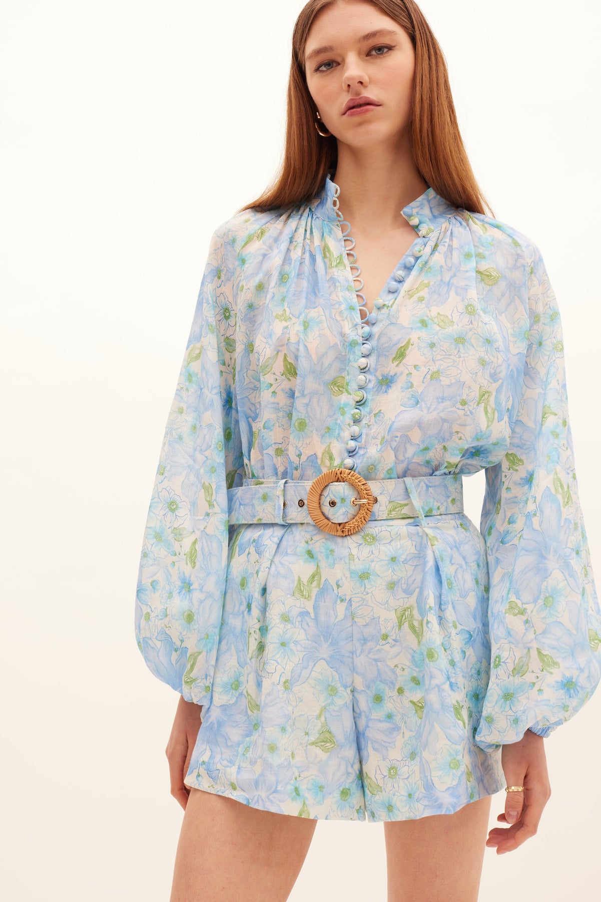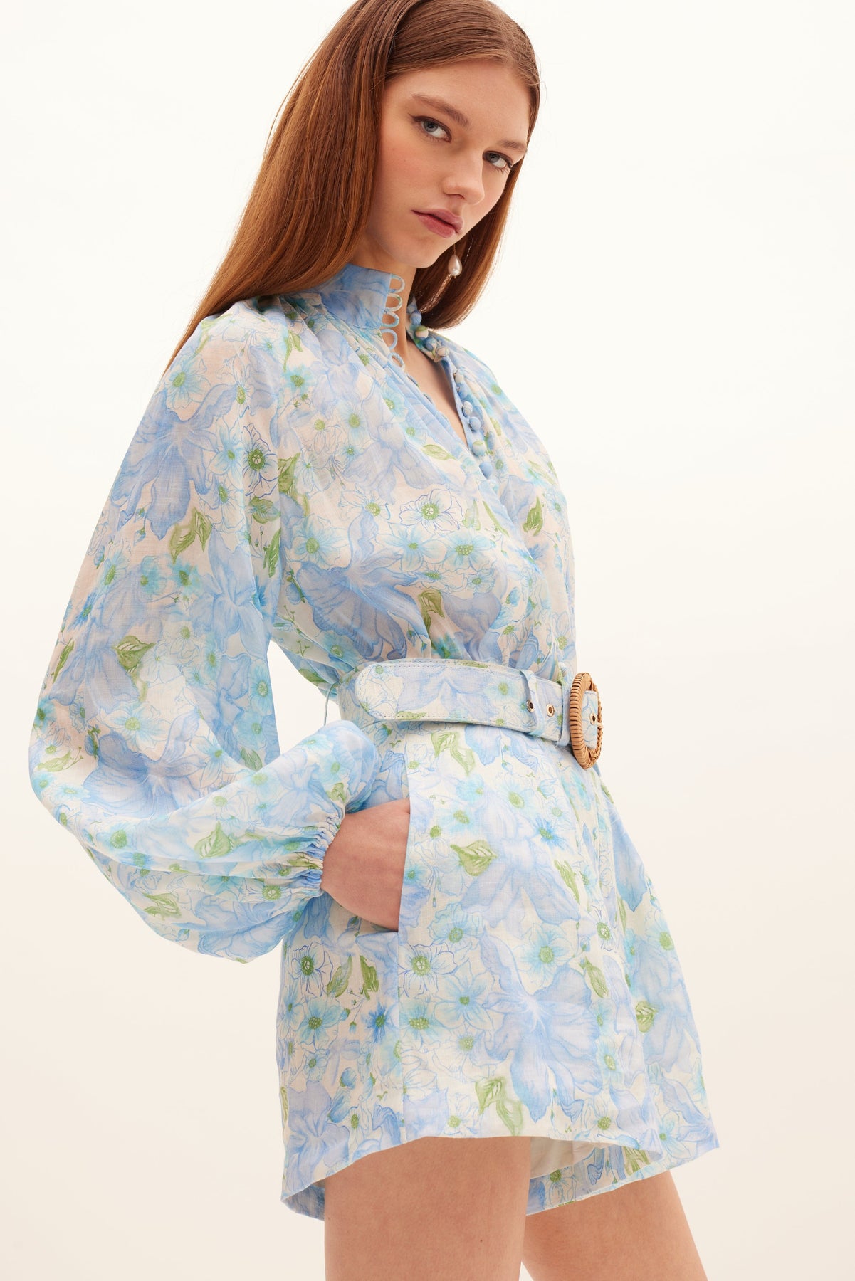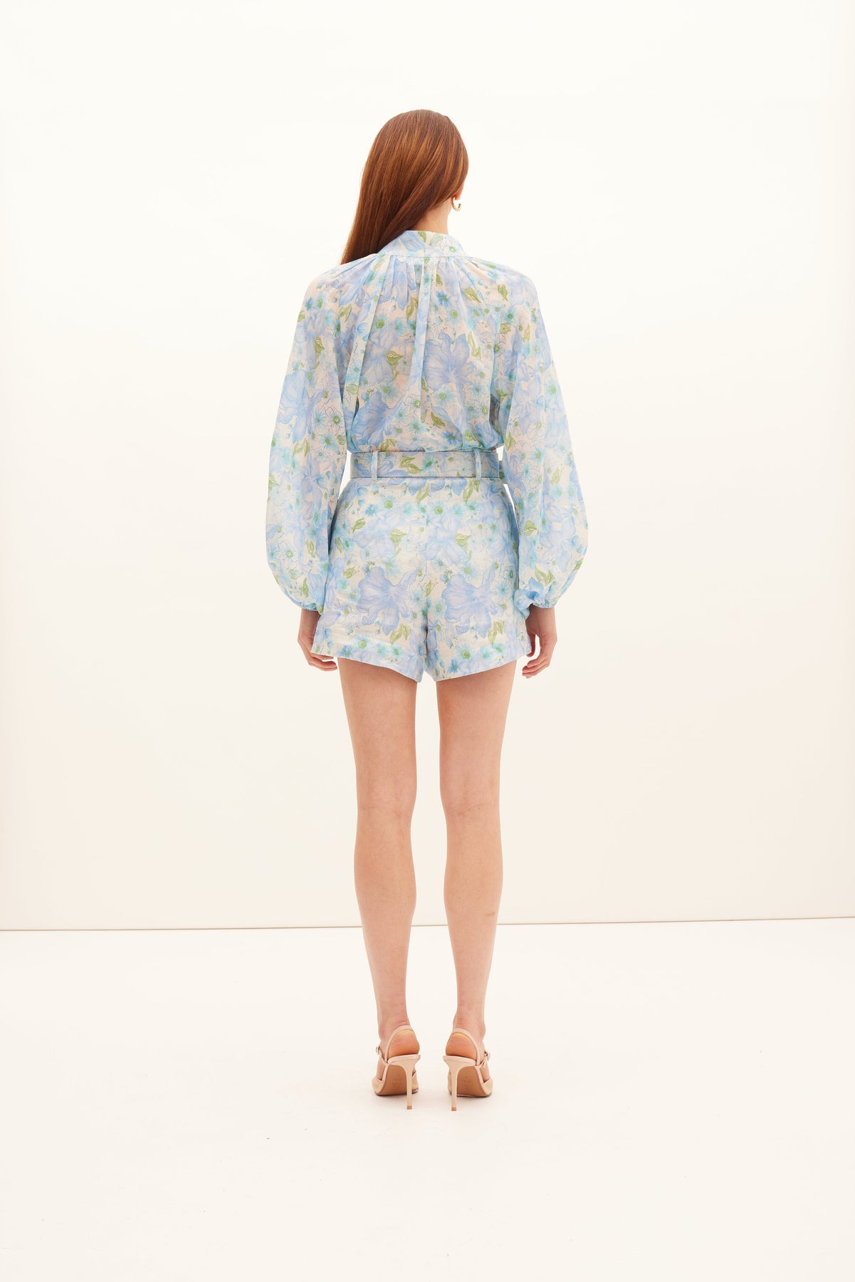 The Poinsettia Dream Short in Laura, a Kate Ford exclusive hand-drawn print from our Collection 'Mi Amor'. A heavy weight linen short featuring a placement printed design, printed placement pockets and a self covered placement printed belt with gold eyelets and a hand-made raffia buckle.