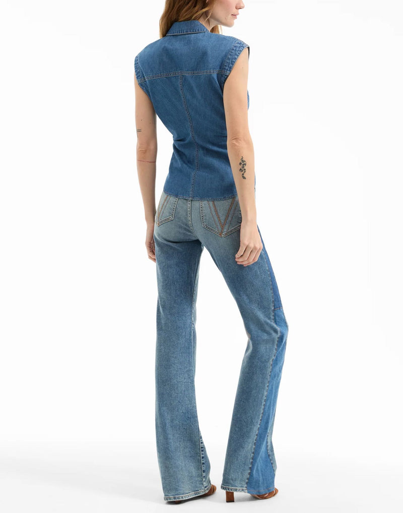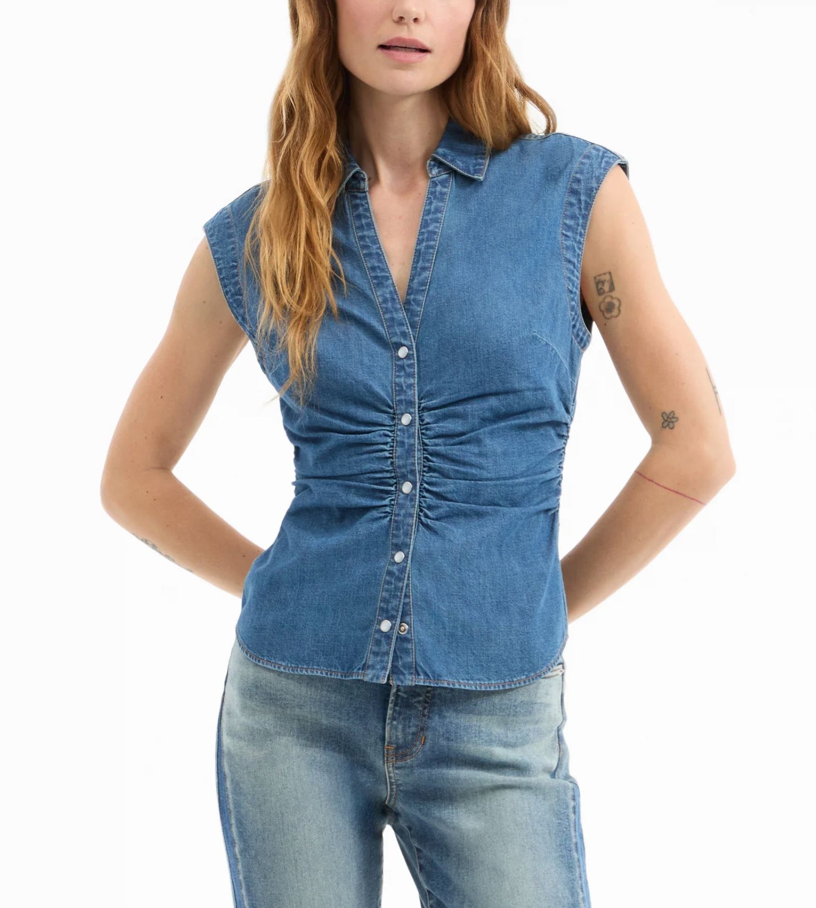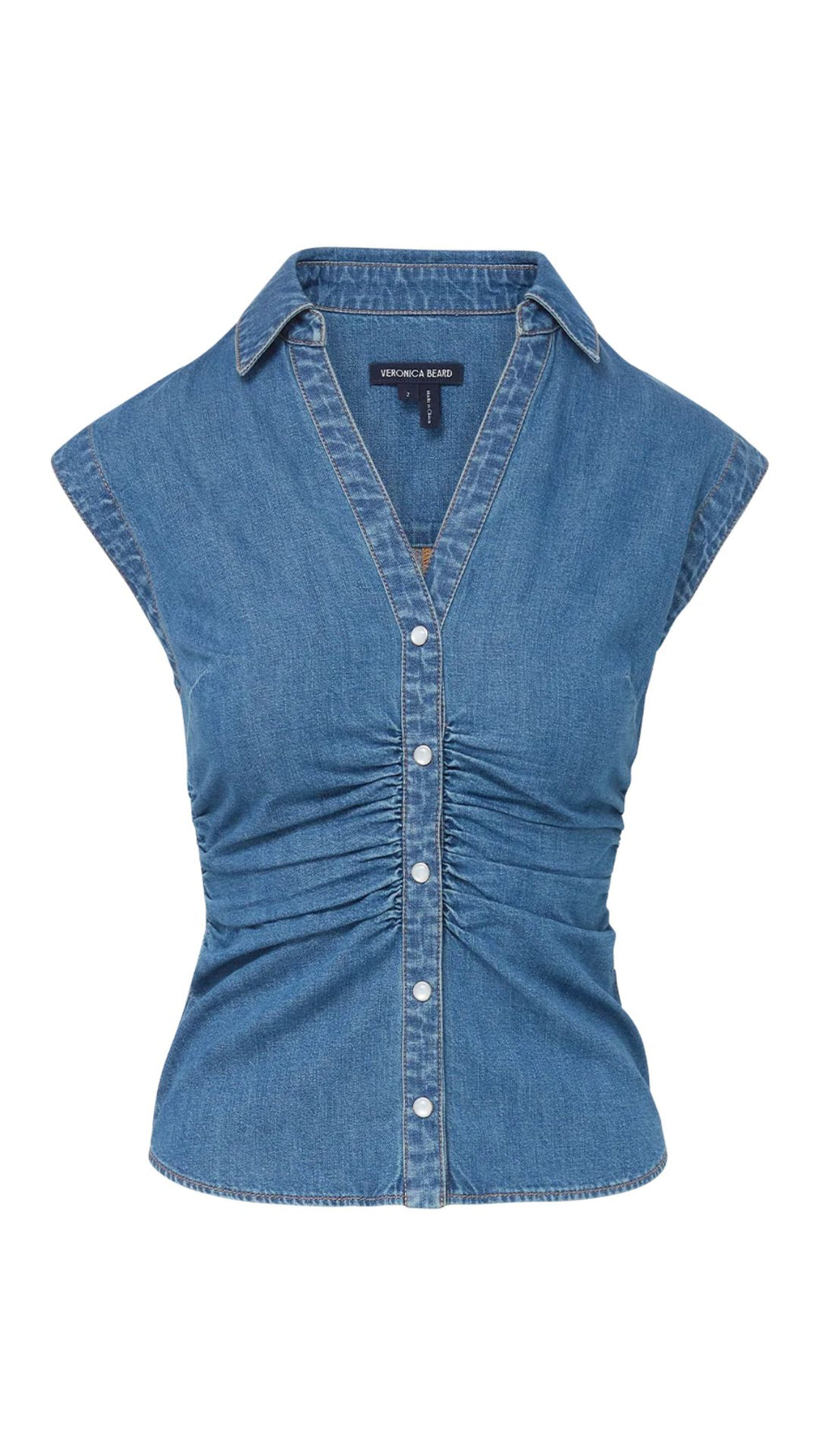 The denim shirt, with a VB twist. Expertly tailored from 100% cotton, the Sera button-down top is defined by front and side ruching for a defined waist. Darting at the bust allows for a superior fit while cap sleeves, a collared V-neck and opalescent buttons complete the look. Pair with jeans for a chic take on double denim.
