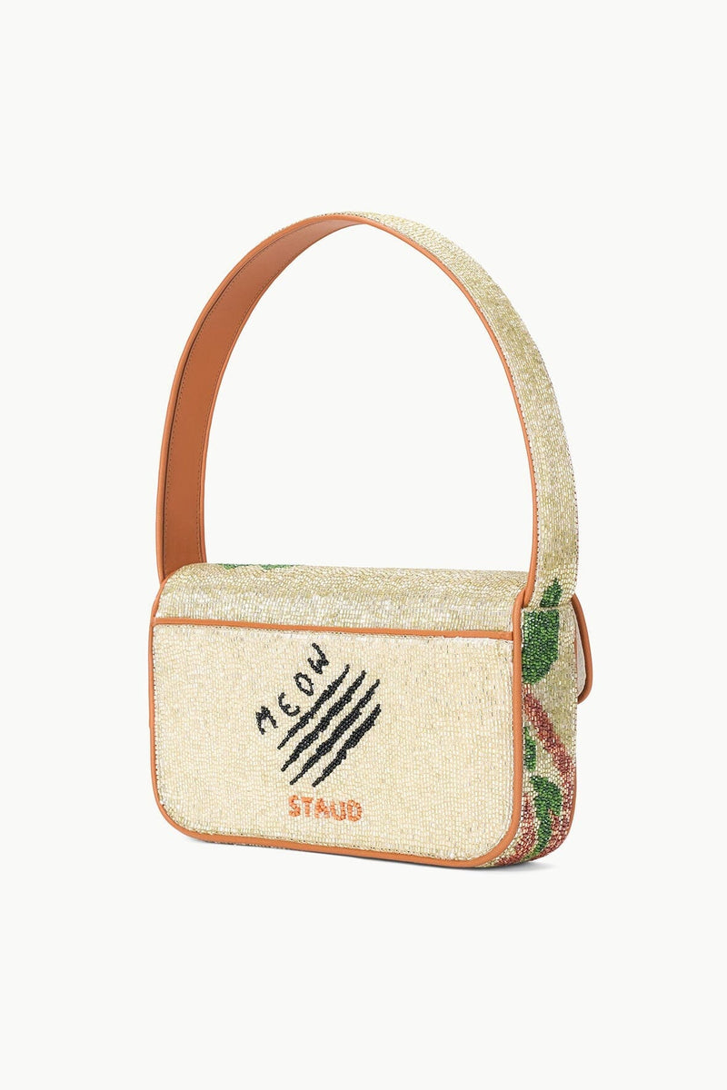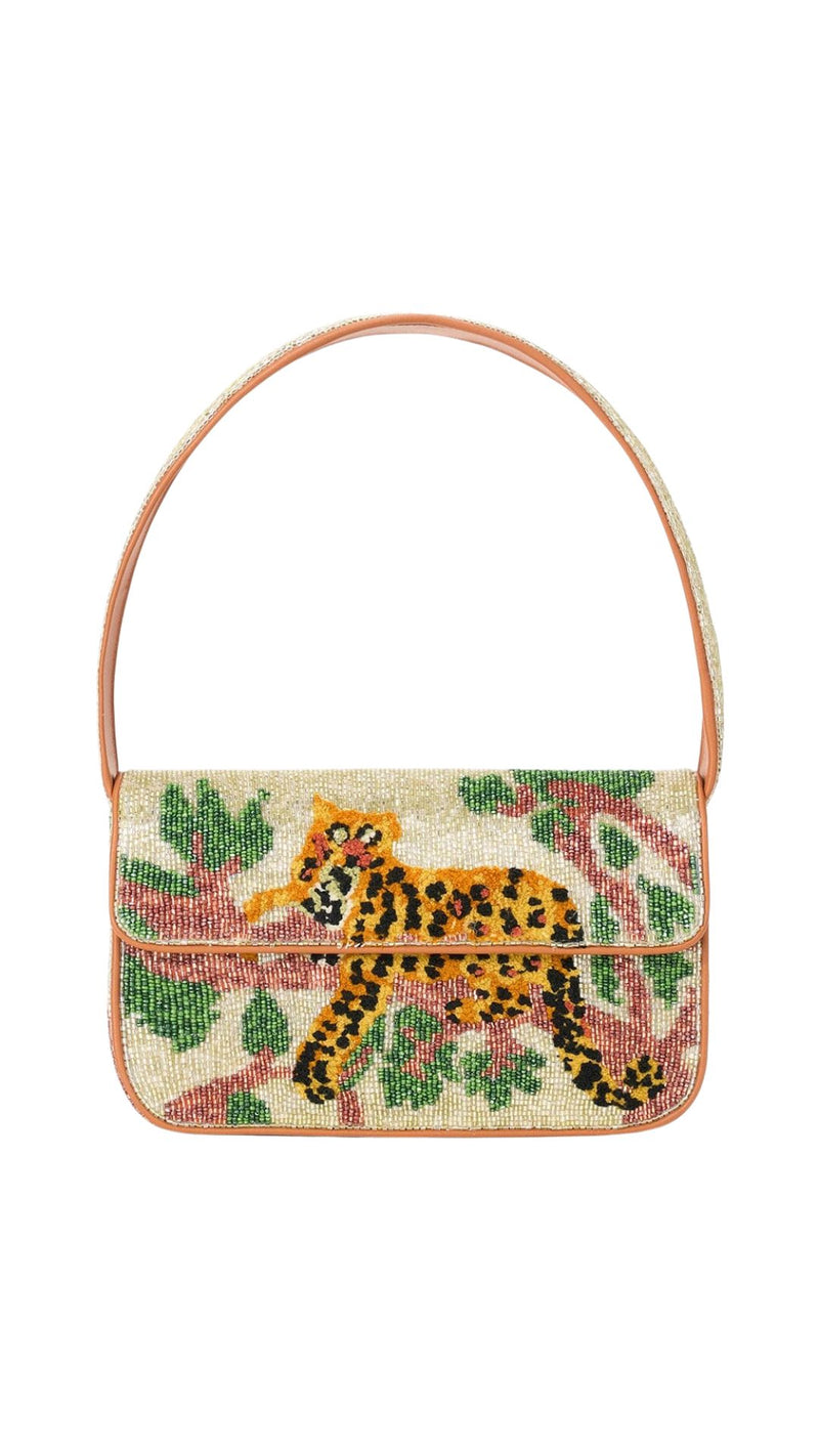 Our best-selling Tommy Bag is updated in a hand-beaded jungle leopard print. This style has vegan leather piping, a magnetic snap closure, and a back slip pocket.