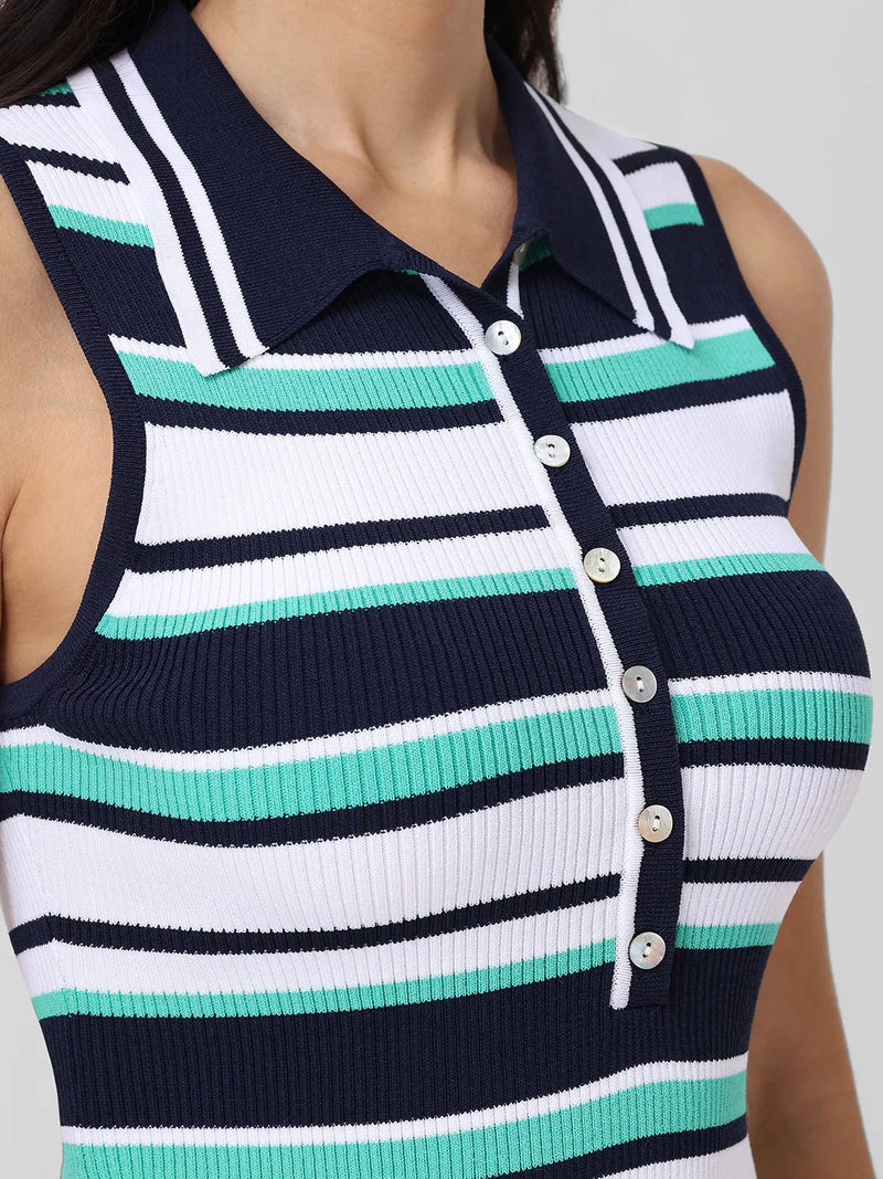 Nautical stripes embolden this stretchy sweater-tank topped with a polished collar and updated in a modern cropped fit.
